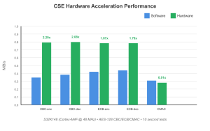 In some cases, such as with CMAC, the hardware implementation may perform slower than the software version. This is typically due to smaller input sizes,since the time required to initialize the CSE and transfer data can exceed the time it takes for the CPU to process the operation in software. Hardware acceleration becomes significantly more beneficial as the input data size increases.